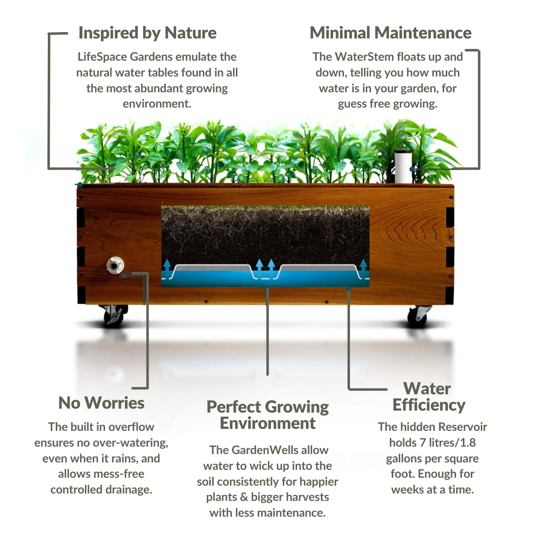 Less water. Low maintenance. Bigger Harvests. If you can fill the reservoir once a week garden success is guaranteed.